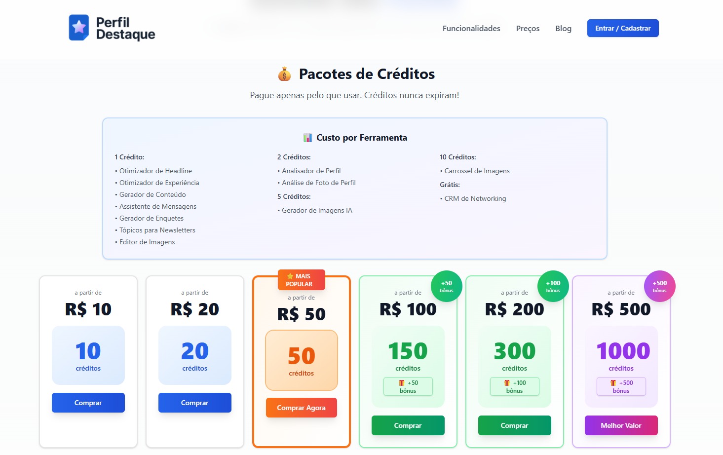 Flexibilidade e Controle: Nosso sistema de créditos significa que você paga apenas pelo que usa. Sem assinaturas mensais que te pressionam. Use a plataforma no seu ritmo, de acordo com a sua necessidade. Os créditos nunca expiram.