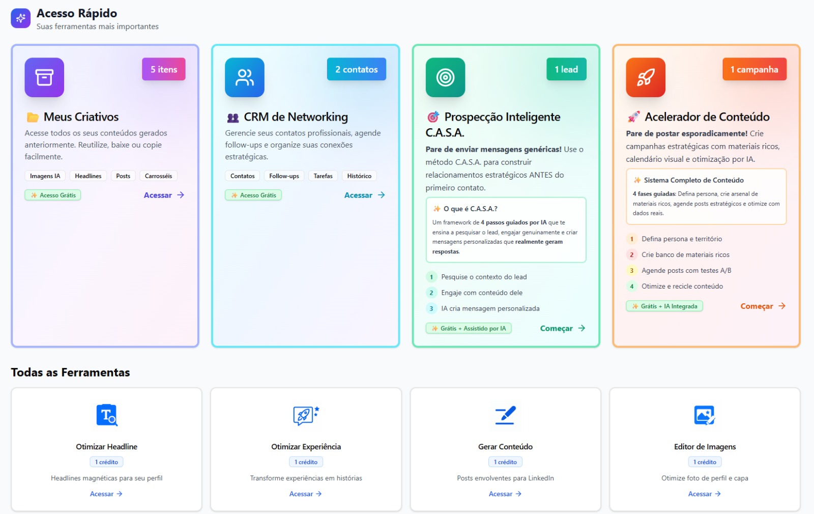 Neste post, vamos mergulhar fundo em como nossa plataforma, alimentada por Inteligência Artificial, foi projetada para resolver os maiores desafios do LinkedIn e transformar seu perfil de um espectador passivo em um protagonista da sua carreira.